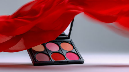 A sleek makeup compact revealing six bold, colorful hues, elegantly displayed atop a gentle background with cascading crimson fabric, evoking sophistication and vitality.