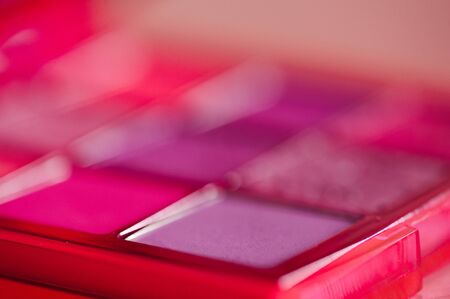 Beauty product closeup. Makeup palette in pink shadow. Selective focus.