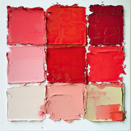 A vibrant array of red and pink paint swatches arranged in a grid showcasing various tones and textures on a white background