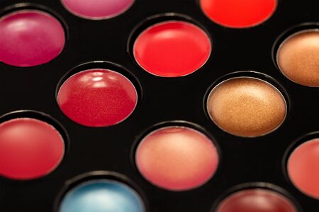 Multicolored eyeshadow. Trendy retro style makeup. Colorful pastel pattern. Cosmetics products for beauty salon. Close up.