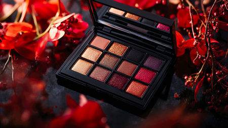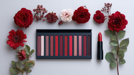 A stunning flat lay featuring an eye shadow palette and a bold red lipstick surrounded by exquisite red flowers. Perfect for beauty and cosmetics promotions.