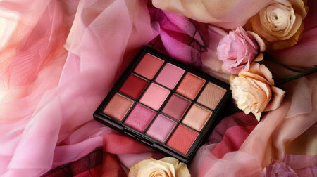 A beautiful blush palette arranged with soft pink flowers and delicate fabric, showcasing vibrant colors and textures, perfect for beauty and lifestyle photography.