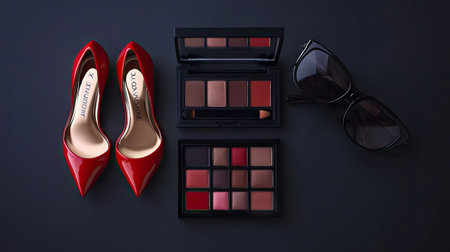 High-fashion flat lay with red heels, eyeshadow palette, and designer sunglasses on black background