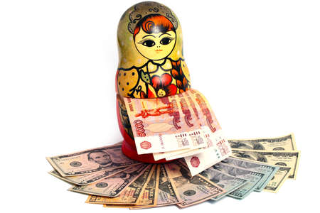 Russian national wooden toy with paper bills standing on a pile of American dollars
