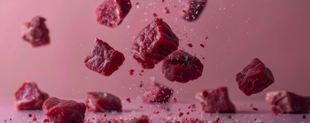 A stunning display of levitating meat cubes against a bold red backdrop, capturing the raw essence of culinary artistry. Perfect for food enthusiasts and creatives. Generated A.I.