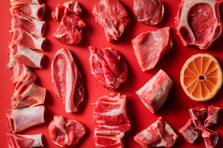 A captivating collection of various cuts of raw meat displayed artistically on a bright red surface, showing their textures and colors. An orange slice adds a vibrant contrast.