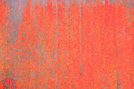 Textured background of grungy metal wall with red peeling paint and corrosion on uneven surface