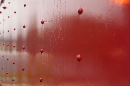 Close view of small mud splatters on a red painted car