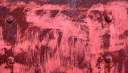 Red old metal surface. Stained, scruffy. Bolts.