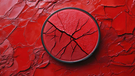 A close-up image featuring a cracked red surface within a circular container, set against a bold, textured background highlighting its artistry and vibrant color.