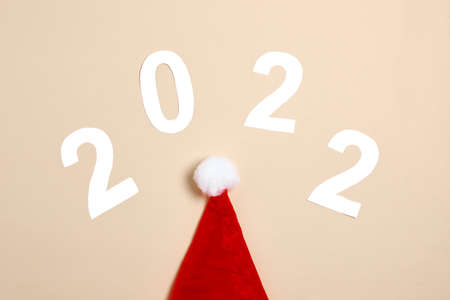 santa hat and 2022 number made from paper. merry christmas and Happy New Year concept on beige background. 2022 creative background, card design