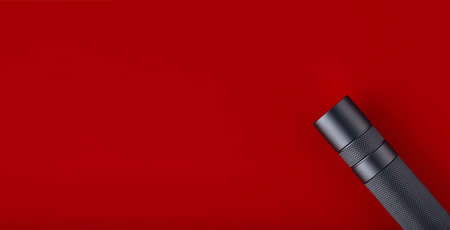 Flashlight on a red background. A beam of light from a flashlight. Finning on the metal body.