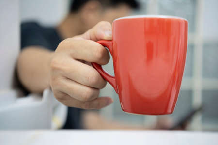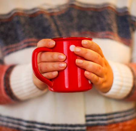 Woman wearing warm sweater holding red cup in her hands with coffee or tea. Comfort concept