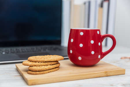 Red cup with polka dots and cereal cookies on a wooden board. Blurred computer and stack of books in the background