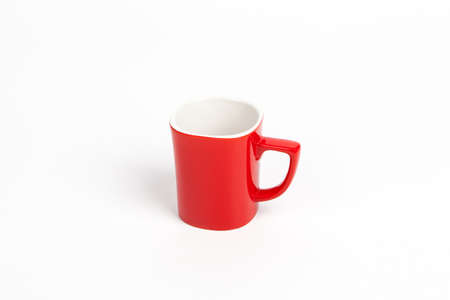 Red ceramic empty cup for espresso coffee on red background. Space for text.