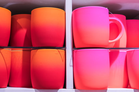 A row of brightly colored cups with a pink and orange gradient. The cups are arranged in a shelf, with some of them being taller than others. The cups are all different sizes and shapes