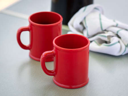 Red green ceramic cups for coffee tea beverages on a rocky sunny stones