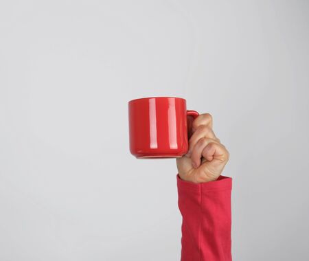 Female hands hold a red cup against the background of a white fluffy sweater with a beautiful red winter manicure. Drink, fashion, morning. New Year. Celebration. Tea coffee.