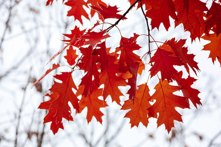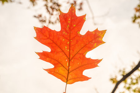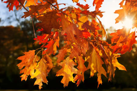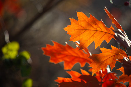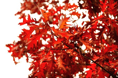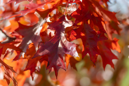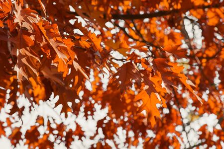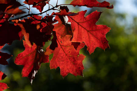 Oak tree red leaves in autumn season backlit by the sun.