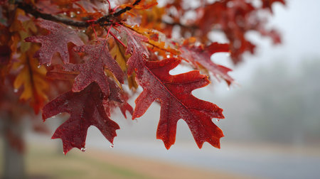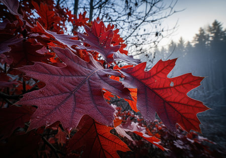Frosty red oak leaves displaying vibrant crimson and deep burgundy colors in a close up view. the background features a cold, moody, and foggy forest landscape, symbolizing the transition to winter.