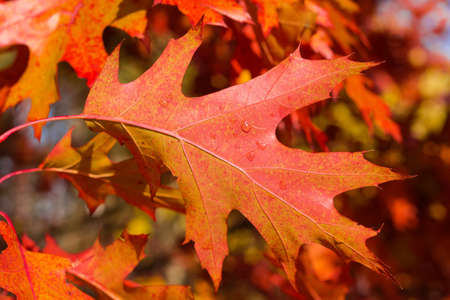 Leaf of northern red oak with dew drops turned red on tree against the other foliage, close-up in selective focus