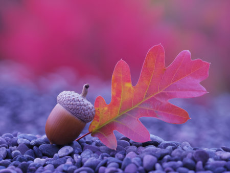 A serene still life featuring an acorn and oak leaf resting on pebbles, set against a vibrant pink and purple backdrop. A beautiful capture of autumn's essence.