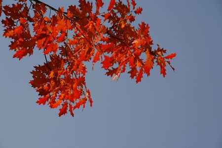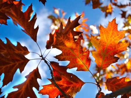 Autumn red oak leaves on the blue sky background.