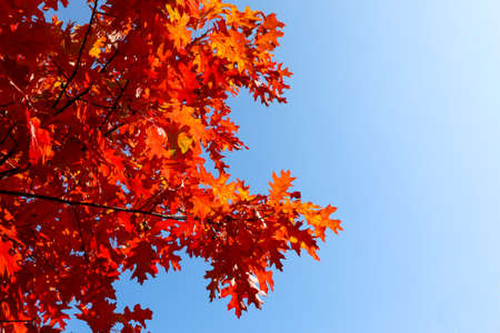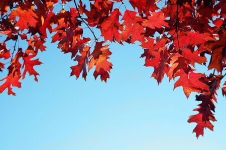 bright red autumn oak leaves against blue sky. colorful autumn background. red oak branch. copy spaces