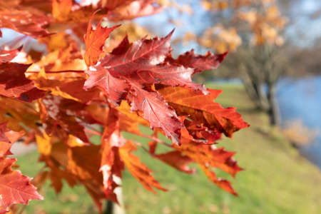 Autumn landscape. Red autumn oak leaves on a branch in the foreground. Autumn time
