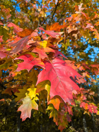 Close-up view of colorful oak tree leaves. Autumn seasonal concept. AI generated.