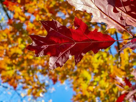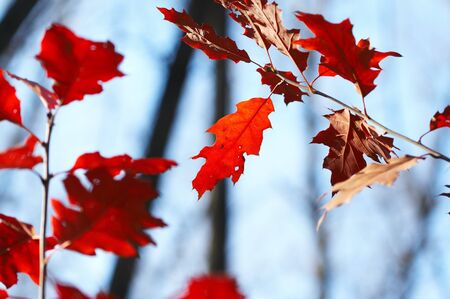 Red autumn oak leaves against the blue sky. Natural background.