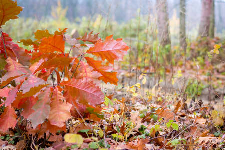Autumn leaves of red oak on a tree on the background of the forest