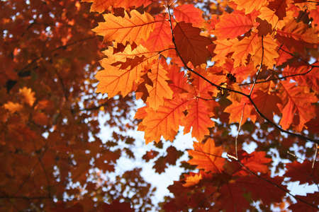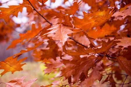 Autumn background of yellow and orange oak leaves and branches in the light
