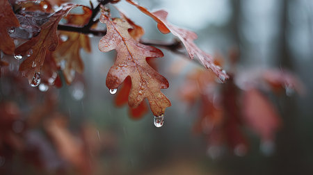 Soft rain falling gently on Red oak, with water droplets forming and slowly dripping. The background is softly blurred with a natural, moody atmosphere.