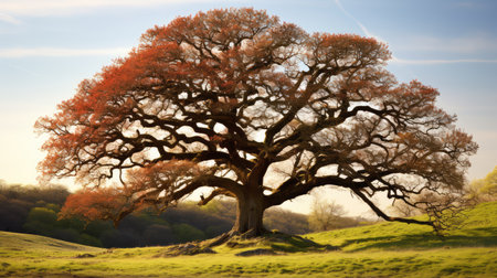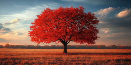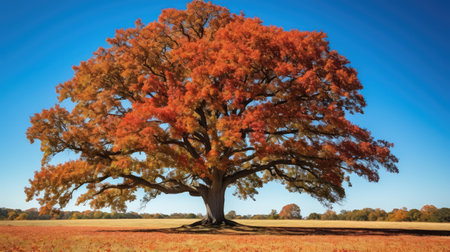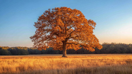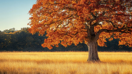A large oak tree in the middle of a golden field, its leaves turning orange and red in the autumn sunlight, creating a stunning seasonal contrast.
