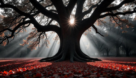 Majestic autumn tree at sunset with radiating sunbeams