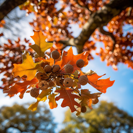 Oak tree. Autumn. Fall scene. Beauty nature scene trees and leaves. Nature background. Selective focus.