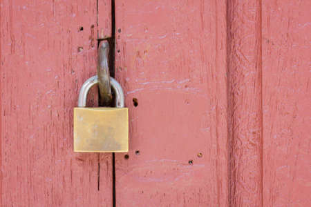 closeup of lock on the middle of pale red wood door, copyspace on the right
