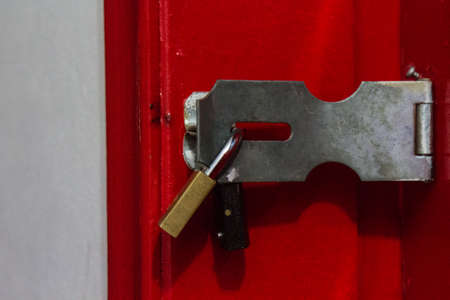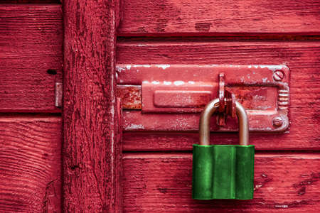 Close up view of green old padlock on the red wooden door.