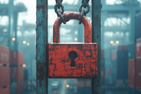 Large padlock hanging on a rusty chain with a blurred industrial port and shipping containers in the background