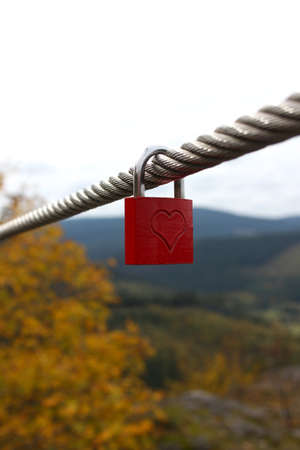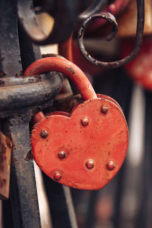 Heart shaped lock. Red colored snap on the bridge. Traditions of lovers. Wedding symbols