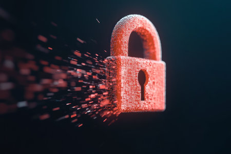 Digital lock icon breaking apart, symbolizing security threats and vulnerabilities.