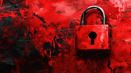A striking red lock set against a vividly painted background, symbolizing security and protection, evoking strong emotions and abstract artistic concepts. Perfect for themes of safety and trust.