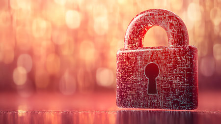 Red digital padlock; data security; bokeh background; cyber safety concept; website banner. AI Generated