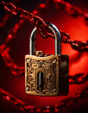 Ornate padlock with red chains in dramatic lighting