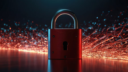 This digital artwork features a glowing padlock symbol representing cybersecurity and protection. It showcases abstract network connections with vibrant colors.