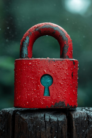 A close-up of a red padlock on a dark surface, symbolizing security and protection.