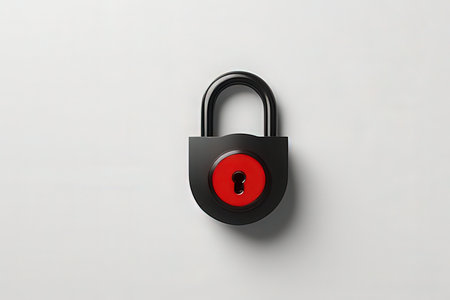 Bright red padlock on a sleek black surface symbolizing security dramatic side lighting close-up shot minimalist style.
