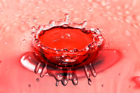 form of water droplets after falling on rippled water surface on red background
