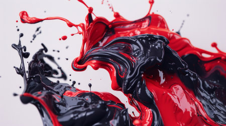 A dynamic collision between red and black liquids, with both splashing and merging in a mesmerizing display of color and movement.